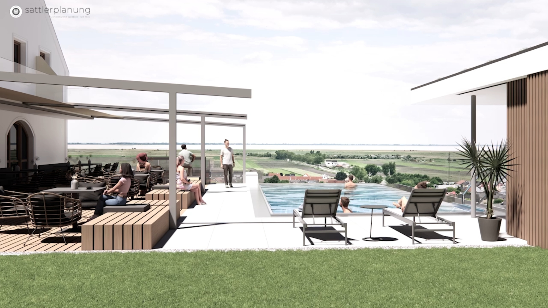 Ausweitung des Wellnessangebotes, Infinity Pool und Sauna mit Ausblick auf den Neusiedler See, Vergrößerung der Balkone mit Ausblick auf den See sowie des gesamten Gartenlounge-Bereiches. Projektabschluss Frühjahr 2026